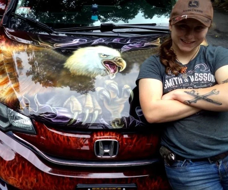My name is Dannielle, but most of my friends call me Danni and I have lived in Massachusetts my whole life. I have been airbrushing for about 12 years now and take on a wide variety of challenges and paint anything from t-shirts to motorcycles to automobiles. Over the years I have accumulated several different skills needed to be able to create such detail-oriented works of art. I am 100% detail oriented and am always trying to be a perfectionist when it comes to realism. I specialize in animals, anything with scales, flames or just anything that needs eye popping realism. My favorite art studies consist of big cats, dragons and any kind of flame you can imagine, whether it be ghost flames, blazing red or blue flames, hot rod flames or even inverted flames! It does not matter the surface: motorcycles, t-shirts, helmets, mailboxes, doors, walls, skateboards and yes, even automobiles! If you can dream it, we can create it! Anything is possible with a little imagination and some artistic skills.
