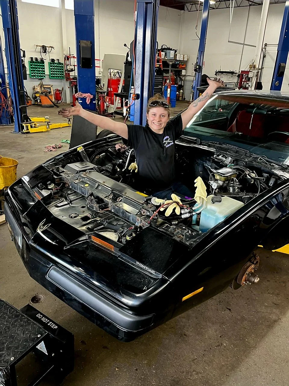 Dannielle can be seen here replacing the engine in this 1988 Pontiac Firebird that has been in her family for over 30 years! Who would have known that her mother’s very first car, (now passed down to her son,) would be fixed up all these years later by her very own daughter! :)